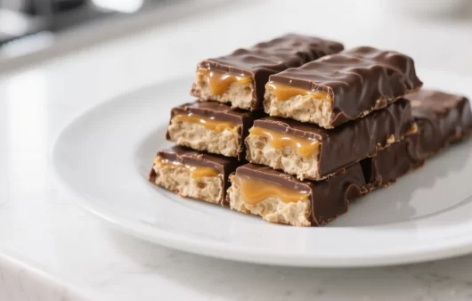 A homemade keto Mars Bar featuring a soft, chewy nougat layer, a rich caramel centre, and a
