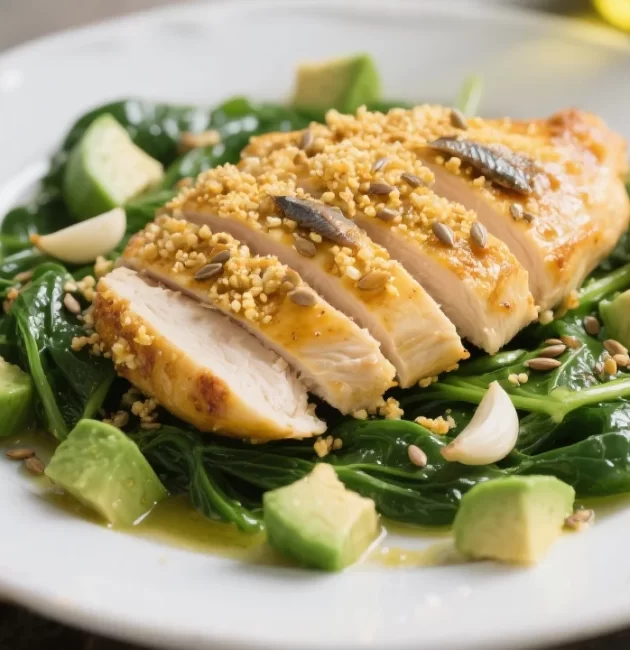 Tender chicken breast fillets are pan-seared and served on a bed of garlicky spinach, topped with creamy avocado and a savoury anchovy and flaxseed crumb. High in protein, low in carbs, and rich in healthy fats.