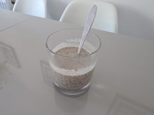 In a bowl, combine milled flax seeds, chia seeds, and almond milk. Stir well.
